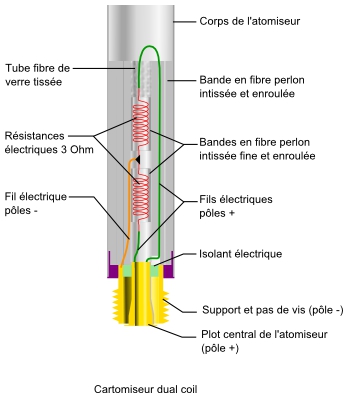 - Atomiseur : élément contenant une résistance et du coton. Il est plus communément appelé résistance.